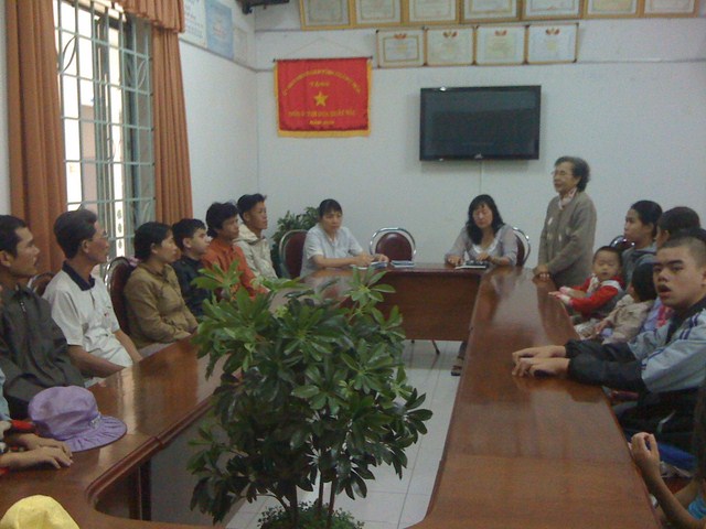 Chị Trần Thị Ngọc Liên, giám đốc Trung tâm trao đổi với các gia đình nhận kinh phí hỗ trợ