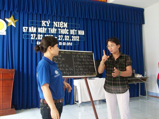 Cô Phan Thị Sen, giáo viên khiếm thính đang hướng dẫn cách chia sẻ thông tin sinh hoạt cho Chủ nhiệm CLB