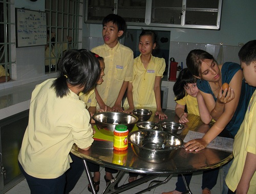 Cô Marie Dattin, nhà hoạt động trị liệu đang hướng dẫn các em làm bánh