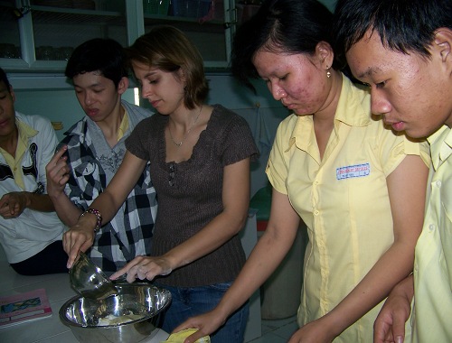 Chuyên viên hoạt động trị liệu hướng dẫn học sinh làm bánh