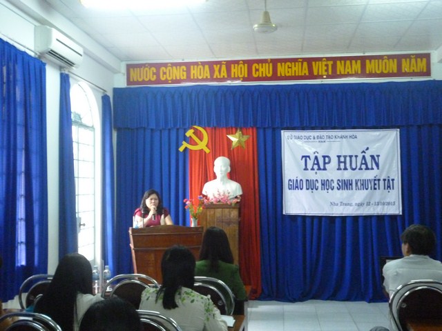Đại diện các Phòng Giáo dục & Đào tạo các huyện, thị xã, thành phố và các cơ sở giáo dục chuyên biệt trên địa bàn tỉnh Khánh Hòa (Trung tâm PHCN - GDTE khuyết tật Khánh Hòa, Trung tâm Bảo trợ xã hội Khánh Hòa, Trung tâm Bảo trợ xã hội và Công tác xã hội thị xã Ninh Hòa, Cơ sở Chăm sóc - Giáo dục trẻ khuyết tật Sao Mai) đã về dự lớp tập huấn.