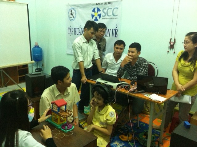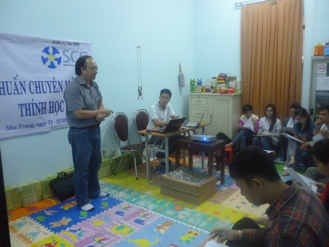 Trong 3 ngày từ 21-23/12/2015, được sự tài trợ của tổ chức Saigon Children's Charity (SCC), Trung tâm đã phối hợp với Công ty TNHH DV trợ thính Quang Đức tổ chức tập huấn chuyên môn Thính học cho 6 cán bộ và giáo viên với mục đích trang bị, nâng cao hơn nữa về kỹ thuật đo thính lực cho cán bộ và đưa máy đo thính lực AD 629 vào sử dụng tại Trung tâm.