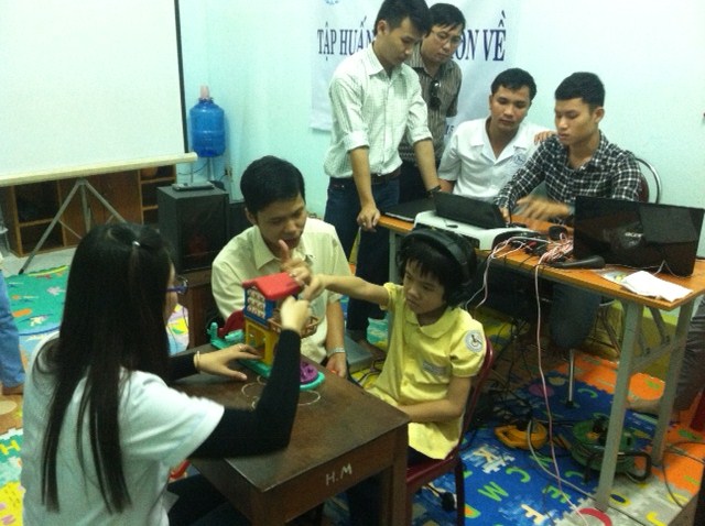 Những hình ảnh Các cán bộ thực hành sử dụng máy đo thính lực và tiến hành đo thử cho các em học sinh đang học tại Trung tâm.