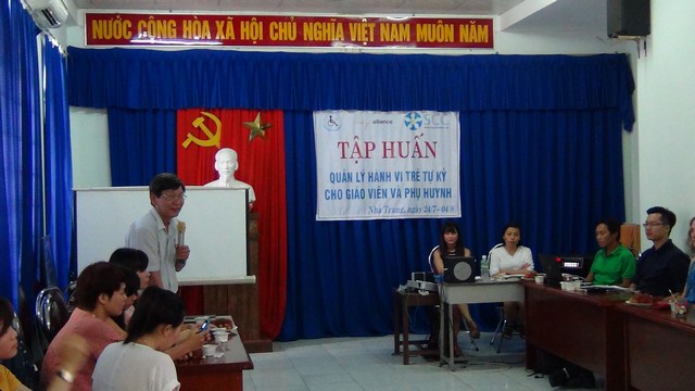 Nhằm nâng cao kiến thức chuyên môn cho giáo viên và phụ huynh về việc giải mã và quản lí hành vi cho trẻ RLPTK, từ ngày 24/7 đến 4/8/2017, Trung tâm PHCN – GDTE khuyết tật Khánh Hòa phối hợp với tổ chức Saigon Children’s Charity (SCC) triển khai chương trình tập huấn “Quản lí hành vi cho trẻ tự kỷ”.