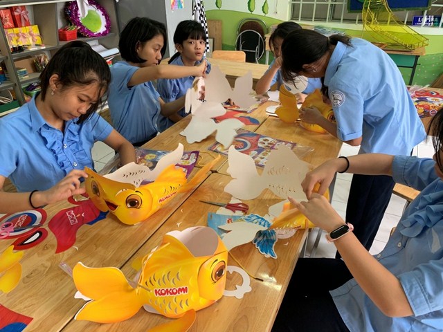Các bạn học sinh gấp dán lồng đèn trang trí Trung thu