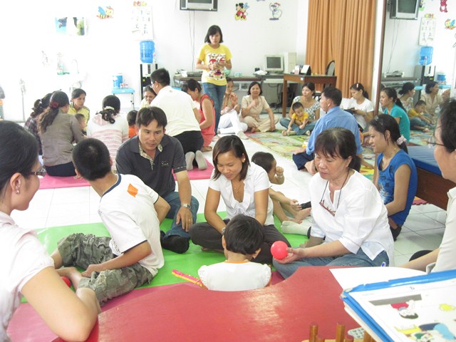 Một số hình ảnh các kỹ thuật viên bệnh viện Nhi Đồng 1 đang chia sẻ kinh nghiệm cho các cán bộ và gia đình trẻ khuyết tật trong lớp tập huấn tại phòng vật lý trị liệu của Trung tâm