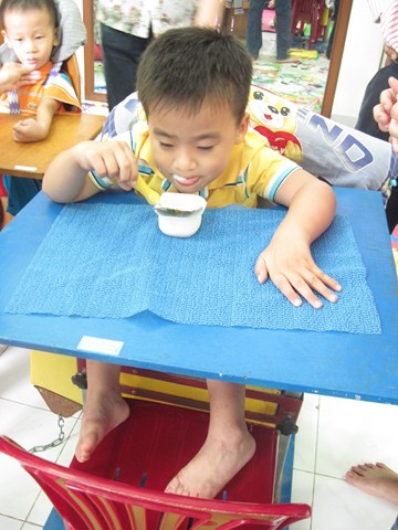 Cho trẻ ngồi đúng tư thế với dụng cụ trợ giúp sẽ giúp trẻ rất nhiều trong việc phục hồi chức năng