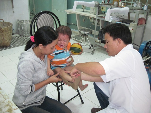 Kỹ thuật viên đang làm dụng cụ trợ giúp cho cháu Văn Vũ Trung Tín ( SN 2011) bị chân chữ o