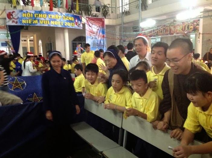 Từ 6 giờ sáng ngày 24.12.2013 tại Trung Tâm Khuyết tật người người vui vẻ ra vào tấp nập . Nhìn lên phía trước cổng chào của TT có bảng hiệu" Hội chợ thắp sáng niềm vui Noel" và các gian hàng gắn những bảng hiệu : ném lon, thảy banh vào rổ , du lịch qua các tỉnh thành , chuột chạy vào hang , bowling, và thổi bóng tạo hình... Tiếng nhạc vang lên từ phòng sinh hoạt :” Đêm thanh nghe tiếng hát của Thiên Thần ..” , “Giáng sinh đang về khắp nơi...” của Tam Ca Áo Trắng hát vang , làm bầu khí vui nhộn hẳn lên...