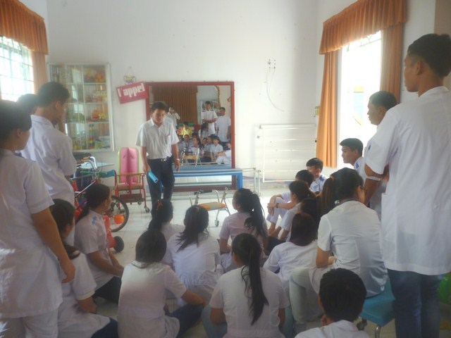 Tại Trung tâm các bạn sinh viên được tham quan phòng Chỉnh hình – Vật lý trị liệu và được các kỹ thuật viên VLTL giới thiệu, hướng dẫn một số bài tập cơ bản dành cho trẻ bại não và một số dụng cụ trợ giúp, dụng cụ chỉnh hình cho trẻ bại não cũng như cách tiếp xúc với các trẻ bại não.