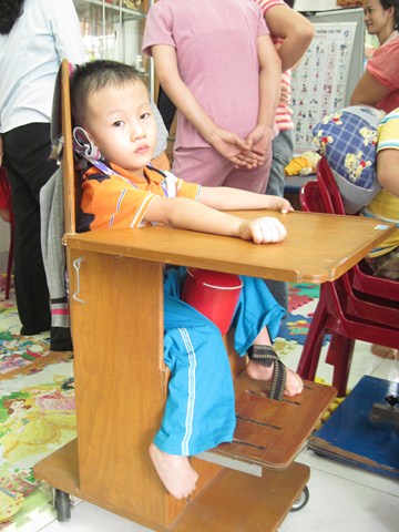 Cho trẻ ngồi đúng tư thế với dụng cụ trợ giúp sẽ giúp trẻ rất nhiều trong việc phục hồi chức năng